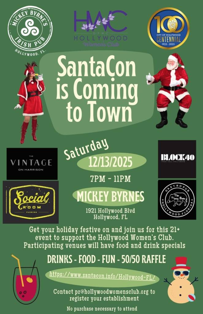 SantaCon Hollywood is back on Saturday, December 13th from 7pm-11pm. Dress up in your favorite festive attire for a pub crawl around Downtown Hollywood. Proceeds benefit the charities supported by the Hollywood Women’s Club. The event is free to attend, participation at pub crawl locations and in the 50/50 raffle is paid. SantaCon Hollywood is presented by Mickey Byrnes Irish Pub and the Hollywood Women’s Club.