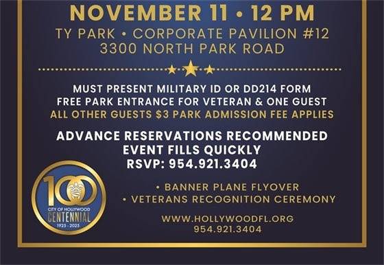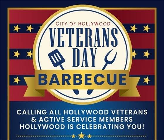All Hollywood Veterans and Active Duty Service Members are invited to join Hollywood’s Mayor and City Commissioners to celebrate at a Veterans Day Barbecue at TY Park, 3300 North Park Road in Hollywood, Corporate Pavilion #12.