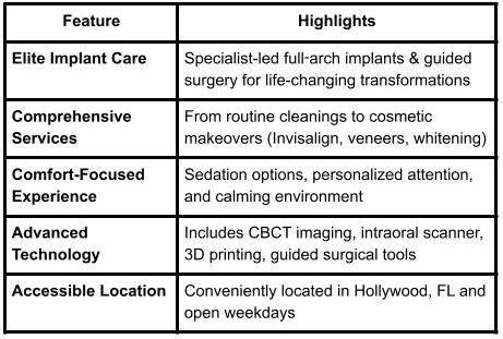 Ascend Dental & Implant Center, led by Dr. Alon Bekerman, is a top-rated Hollywood, FL practice specializing in comprehensive implant dentistry and cosmetic solutions. With a focus on full-arch dental implants, Dr. Bekerman brings extensive experience—placing over 1,000 implants and earning Diplomate status with the International Dental Implants Association (Ascend Dental and Implant Center).
