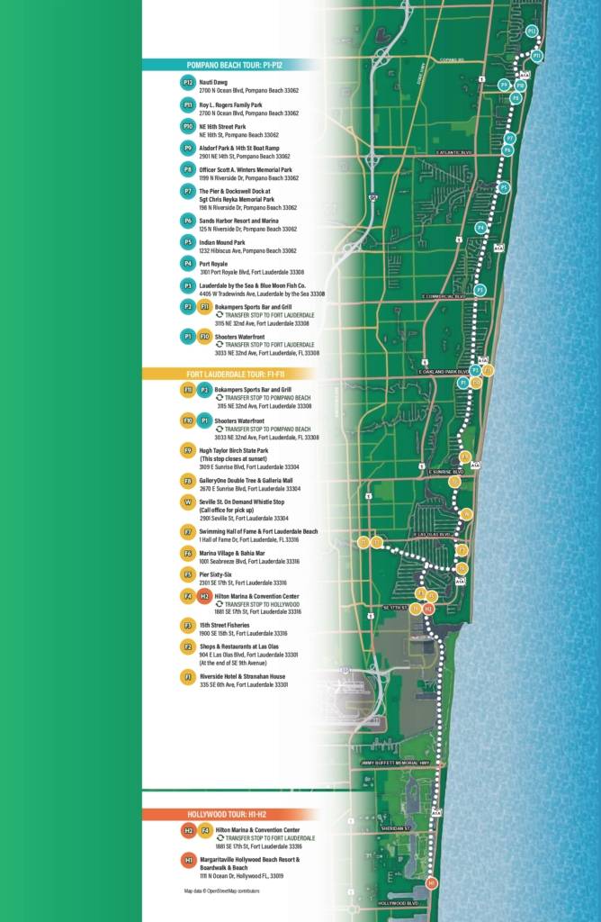 We have 1 stop in Hollywood. 11 stops in Fort Lauderdale (+10 more stops with the Water Trolley), and 12 stops in Pompano.